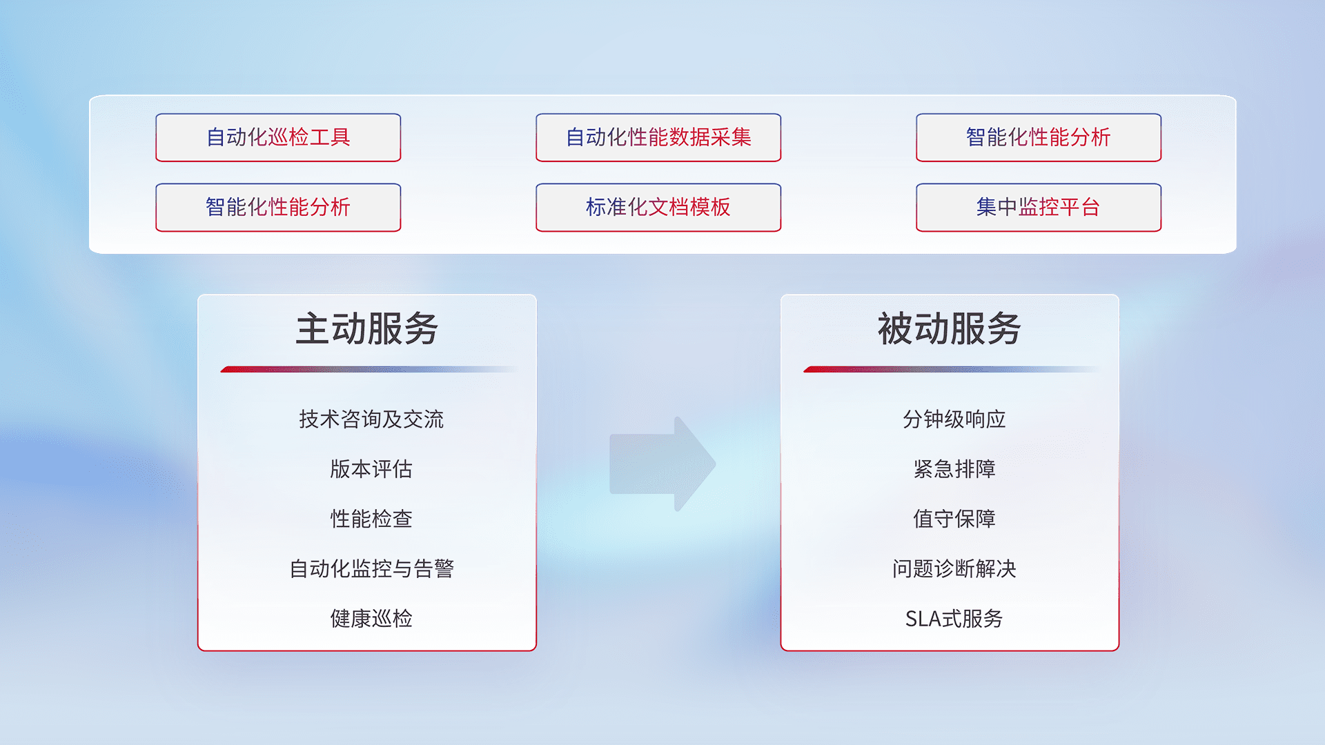 智能化工具和标准化文档,,,保障服务质量,,,提供主动服务(包含技术咨询、、、版本评估、、、性能检查、、、自动化监控与告警、、、健康巡检)和被动服务包含(分钟级响应、、、、紧急排障、、值守保障、、、问题诊断解决、、SLA服务)。。。。