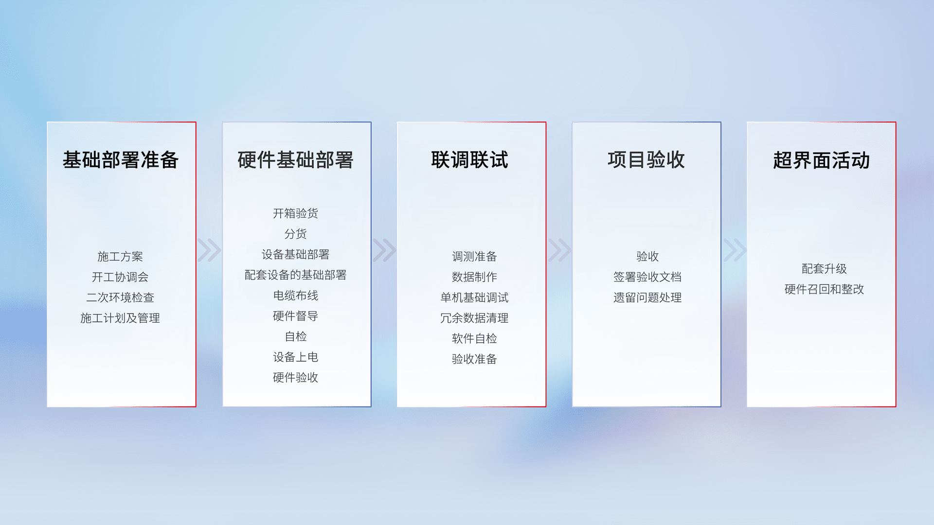 从基础部署准备、、、硬件基础部署、、联调联试、、项目验收、、、越界面活动的全过程可追溯,,,,保证施工质量和进度。。。